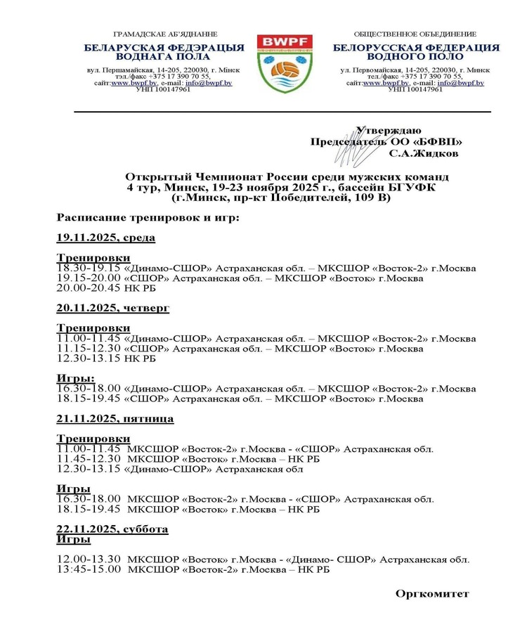 19 – 23 ноября 2025г. в бассейне БГУФК (г.Минск, пр-кт Победителей, 109 В) состоится 4 тур Открытого Чемпионата России по водному поло среди мужских команд, в котором принимает участие ватерпольная команда «Белая Русь» (Республики Беларусь).