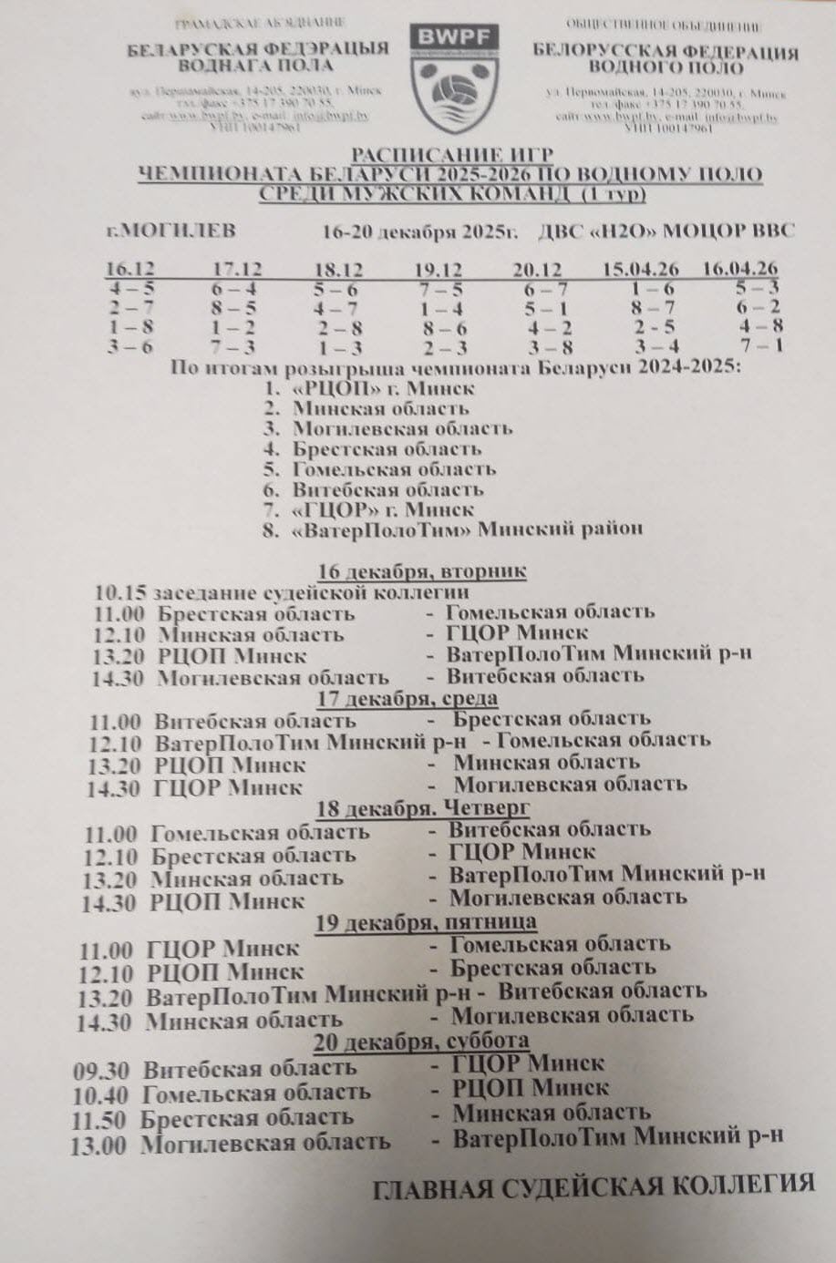 16 – 20 декабря 2025г. во Дворе водного спорта «H2O» (г.Моглиёв, ул.Златоустовского, 1) состоятся игры первого тура Чемпионата Республики Беларусь сезона 2025 – 2026г.г. по водному поло среди мужских команд.