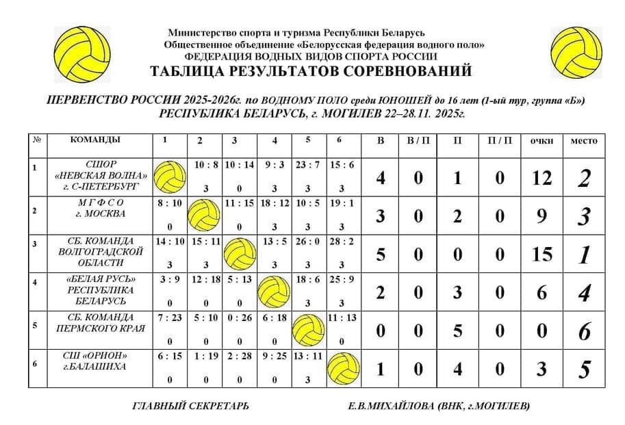 22 – 28 ноября 2025г. в г.Могилёв (Республика Беларусь) во Дворе водных видов спорта «H2О» проводится первый тур Первенства Российской Федерации по водному поло среди мужских команд (юноши до 16 лет, группа «В») сезона 2025 – 2026г.г.